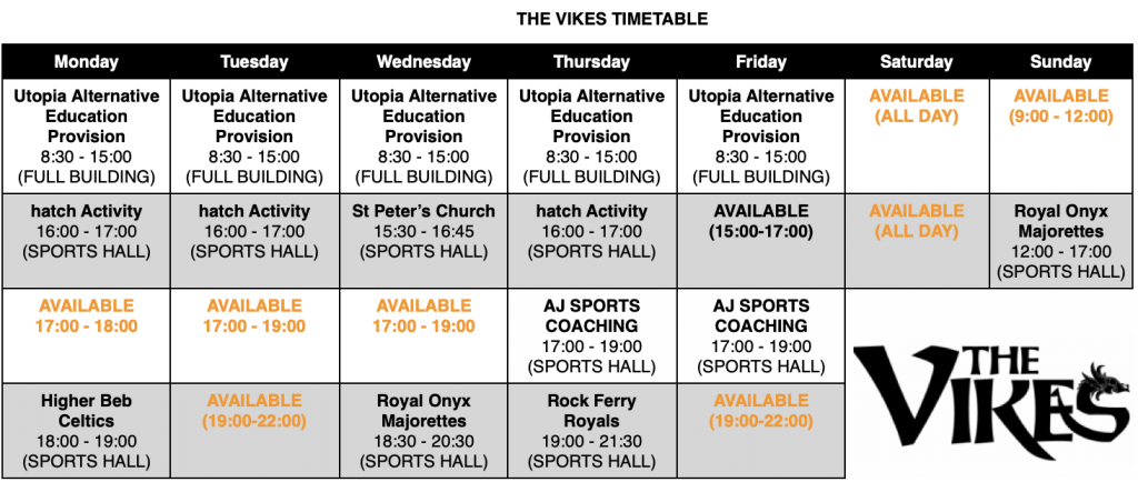 The timetable of weekly events can be seen on The Vikes timetable below: